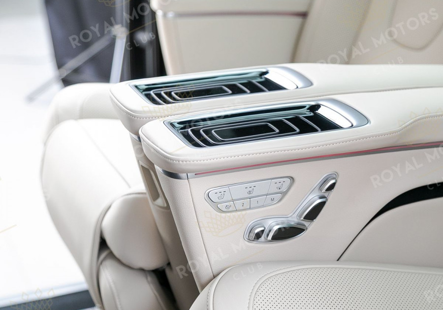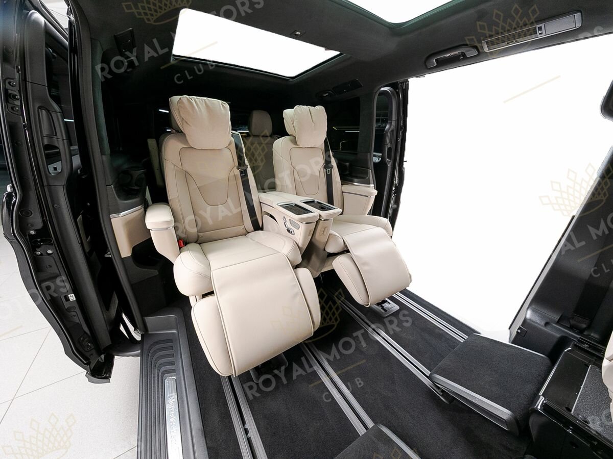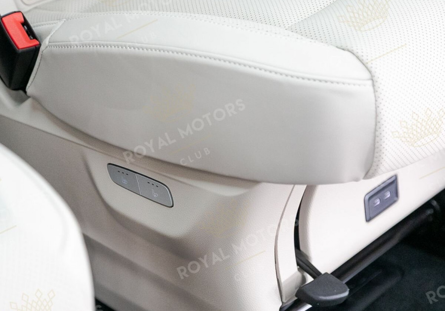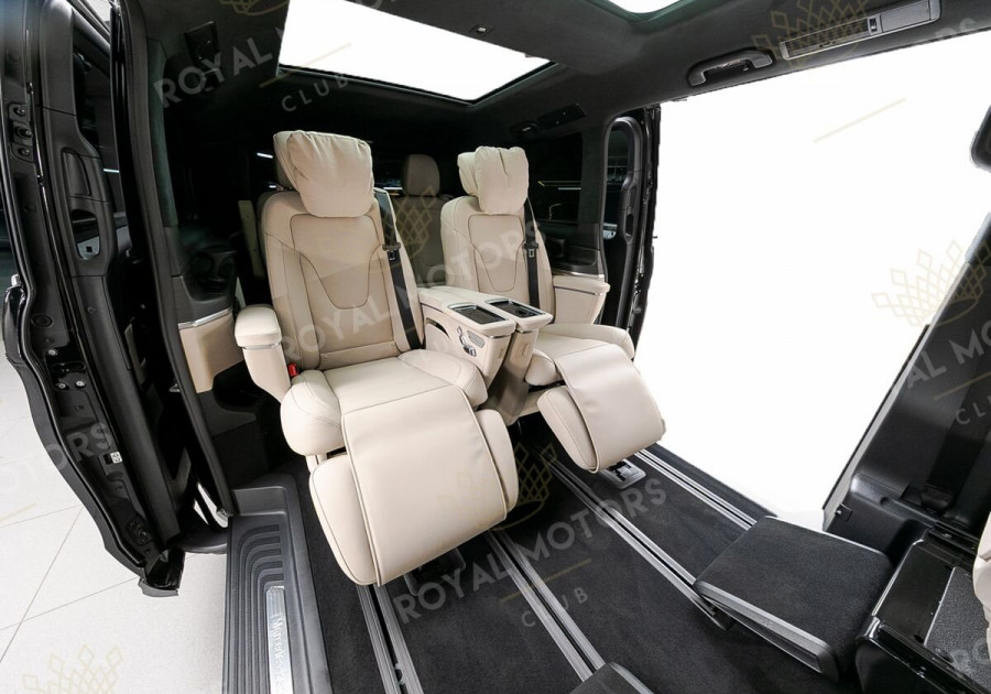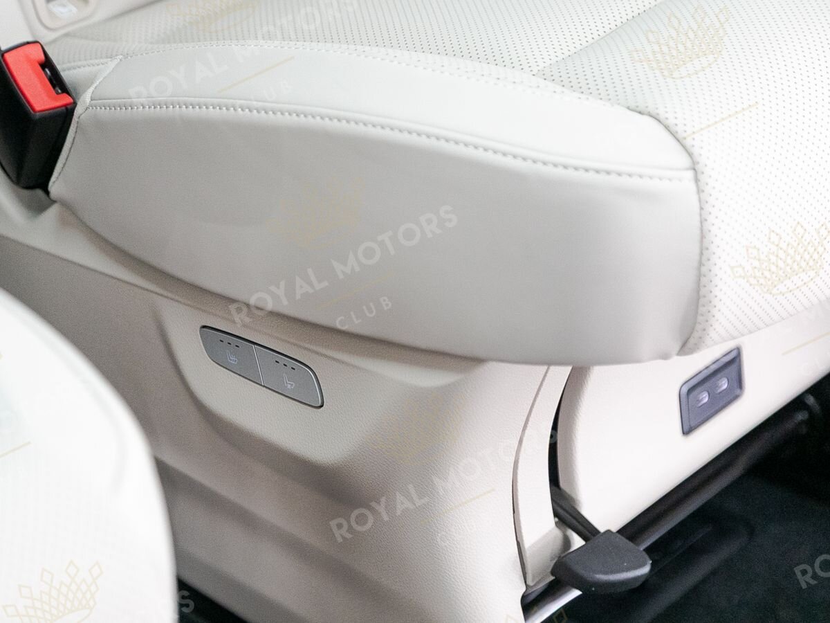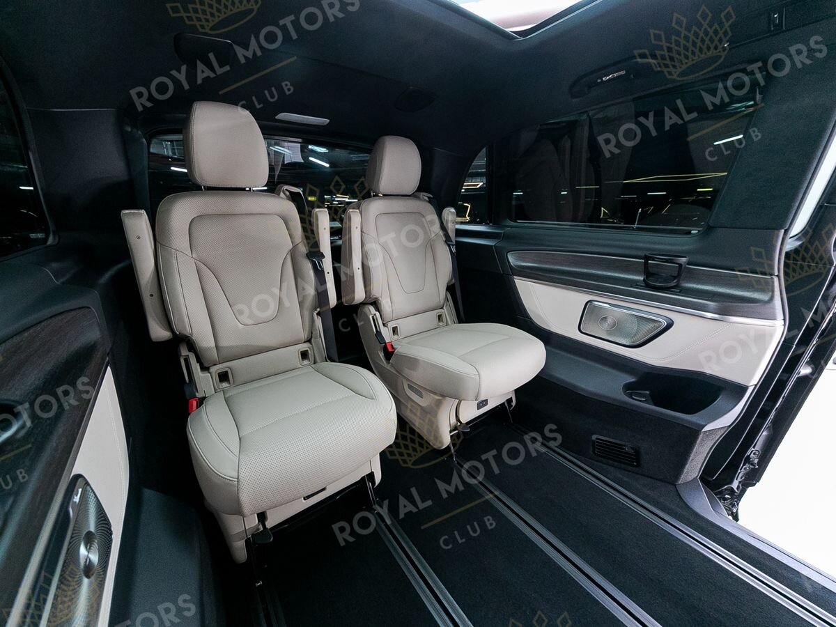 Комплектация оснащена пневматической подвеской, камерами с обзором 360, массажем/вентиляцией сидений, капитанскими сиденьями с системой оттоман, складными столами, панорамой, эл приводом передних сидений и премиальной аудиосистемой Burmester.