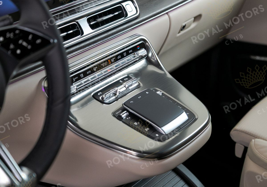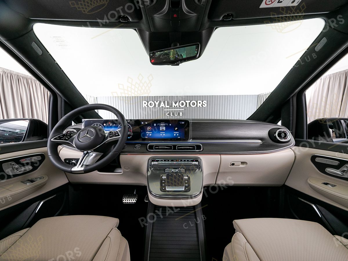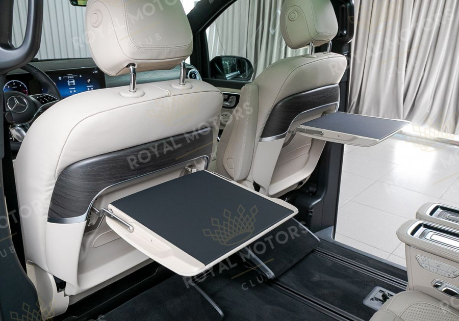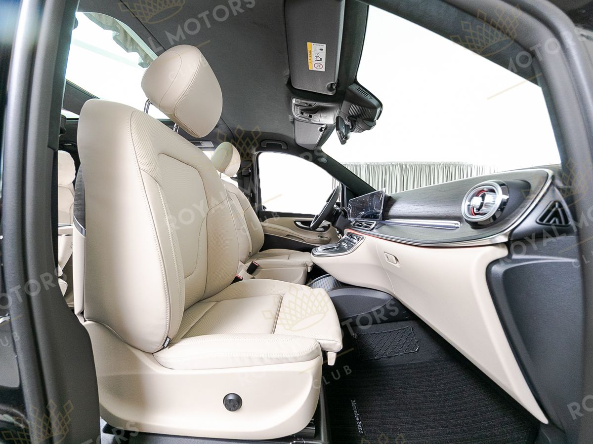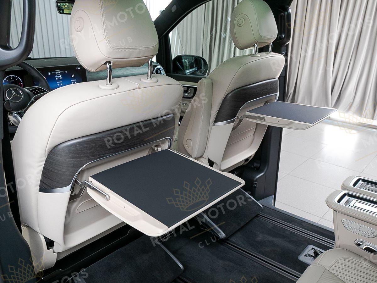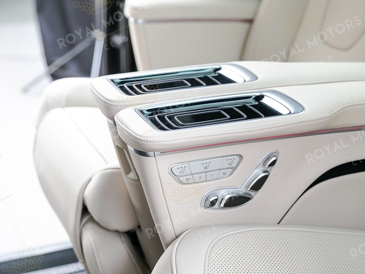 Комплектация оснащена пневматической подвеской, камерами с обзором 360, массажем/вентиляцией сидений, капитанскими сиденьями с системой оттоман, складными столами, панорамой, эл приводом передних сидений и премиальной аудиосистемой Burmester.