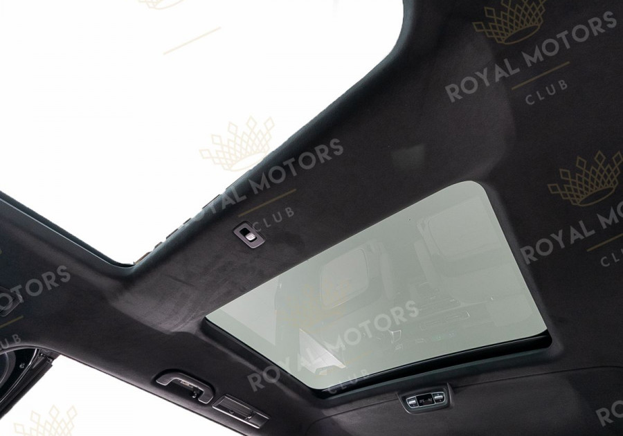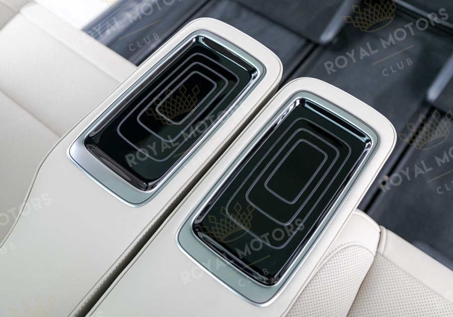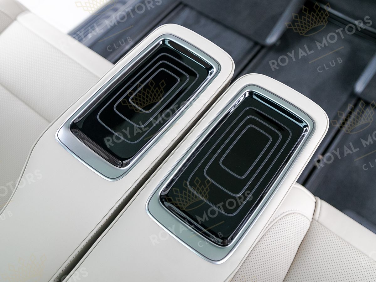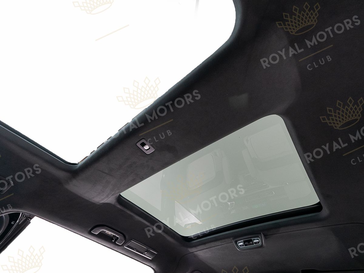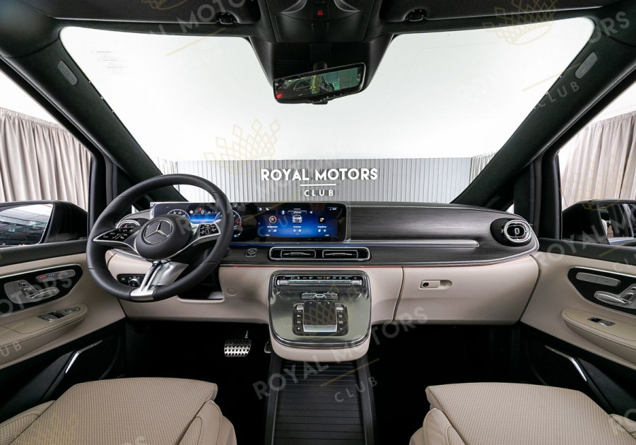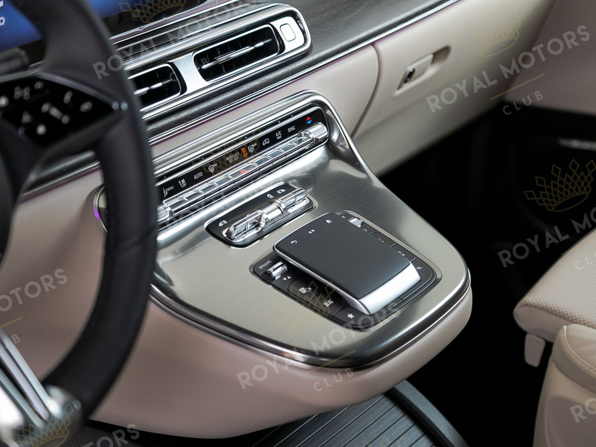 Комплектация оснащена пневматической подвеской, камерами с обзором 360, массажем/вентиляцией сидений, капитанскими сиденьями с системой оттоман, складными столами, панорамой, эл приводом передних сидений и премиальной аудиосистемой Burmester.