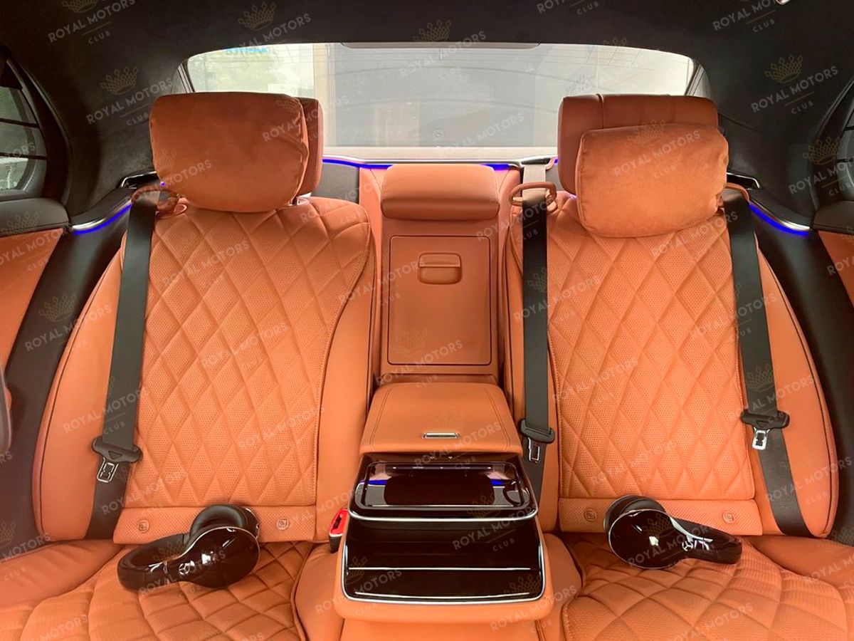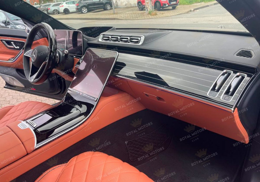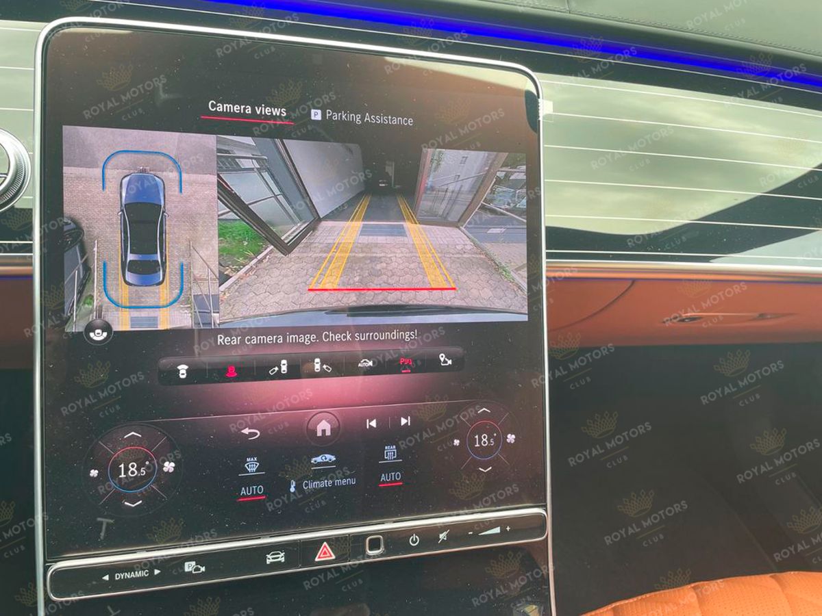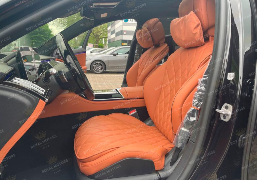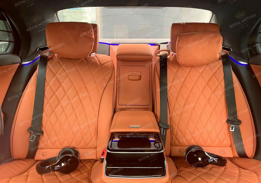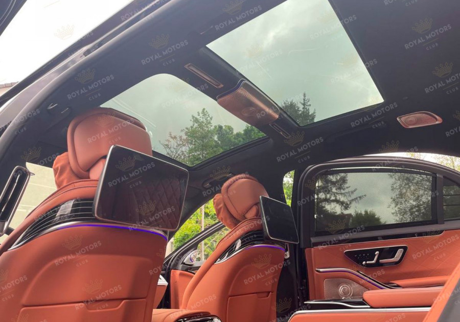 Комплектация оснащена AMG-пакетом, пневматической подвеской, камерами с обзором 360, мониторами в спинках передних сидений, активным круиз-контролем, проекцией, вентиляцией/массажем всех сидений, солнцезащитными шторками и премиальной аудиосистемой Burmester