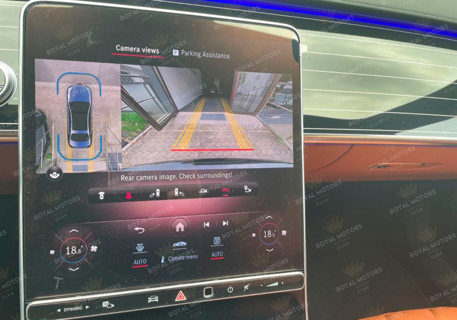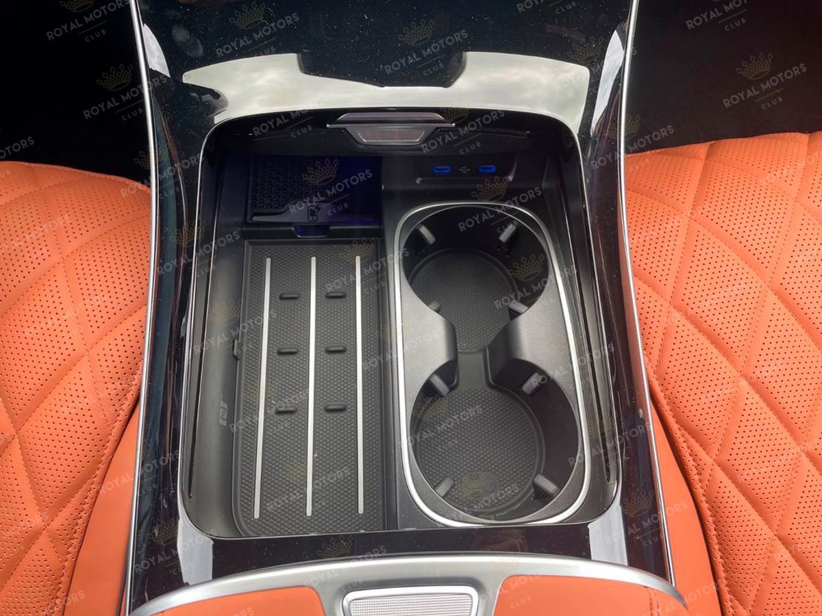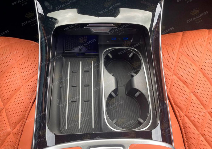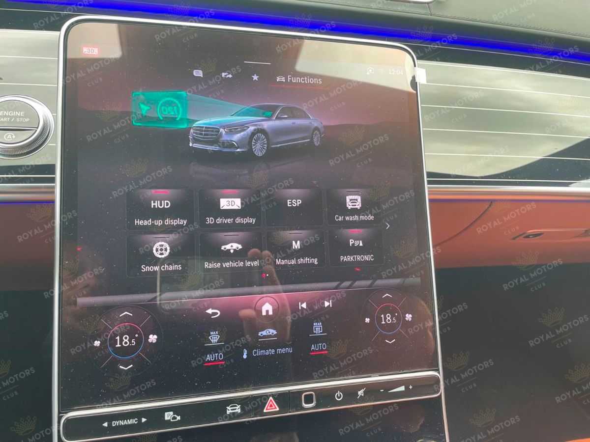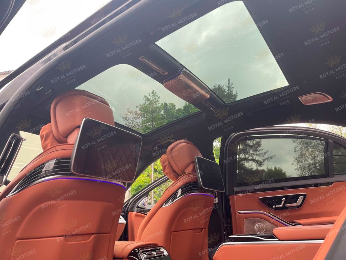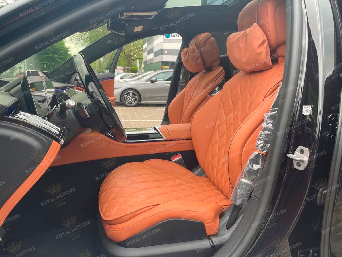 Комплектация оснащена AMG-пакетом, пневматической подвеской, камерами с обзором 360, мониторами в спинках передних сидений, активным круиз-контролем, проекцией, вентиляцией/массажем всех сидений, солнцезащитными шторками и премиальной аудиосистемой Burmester