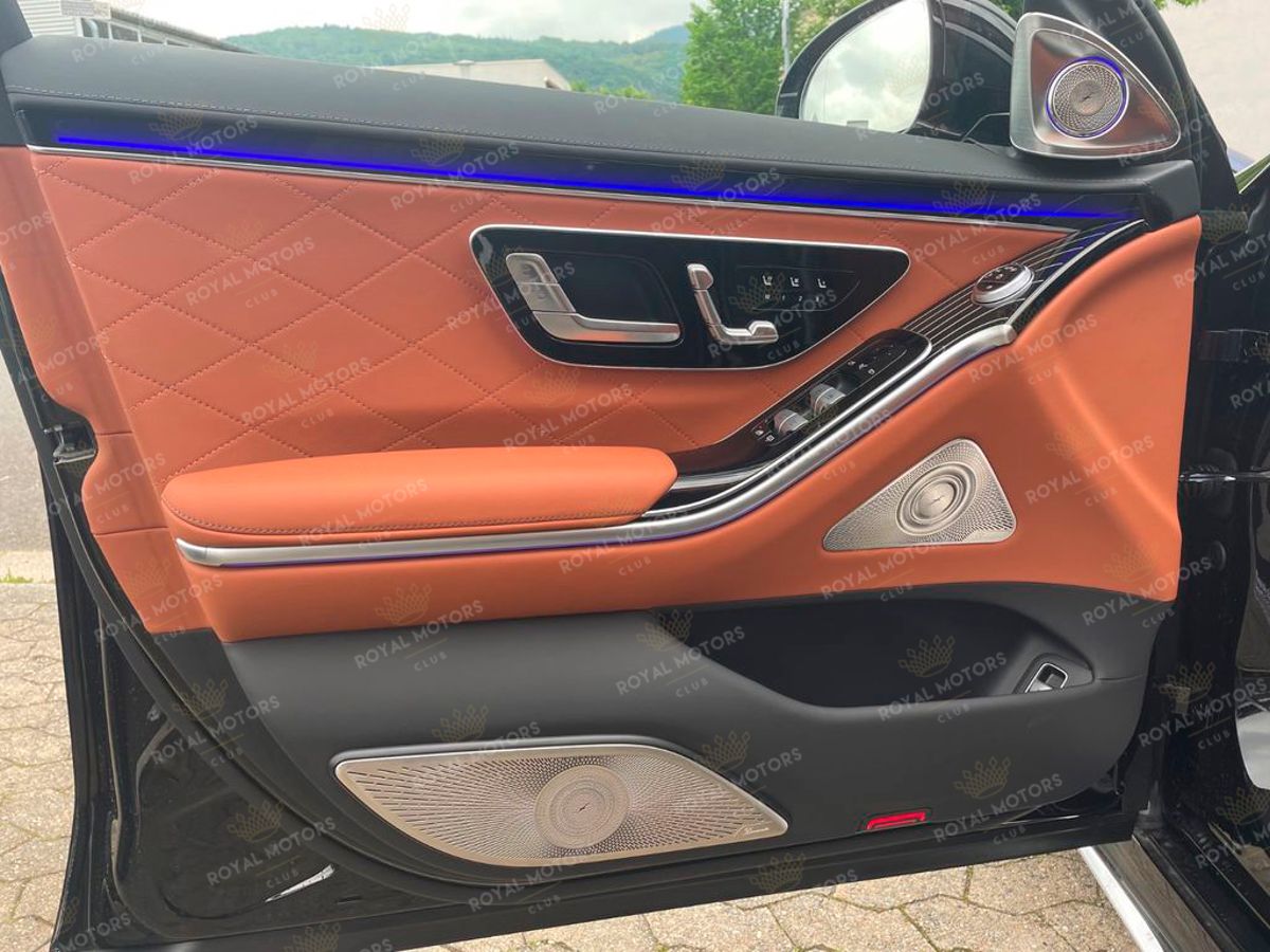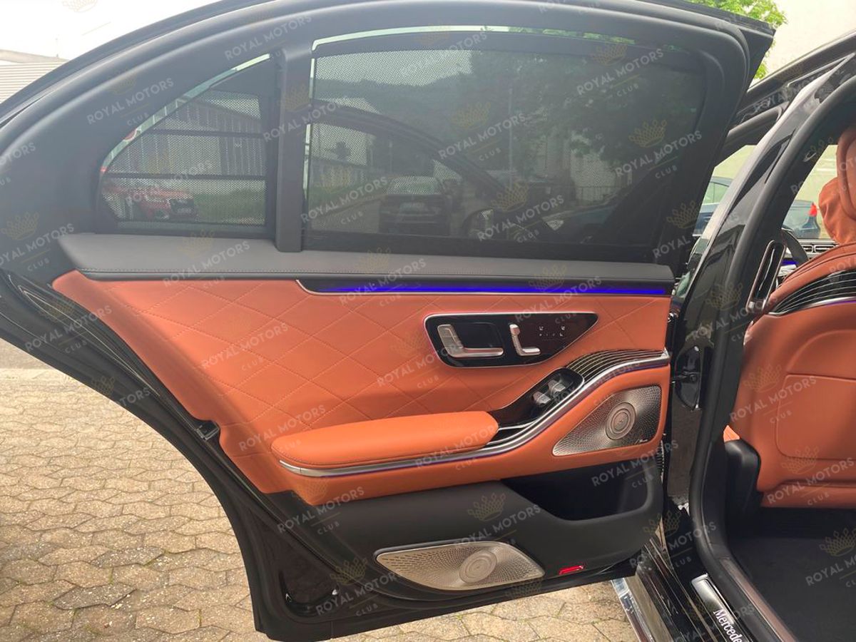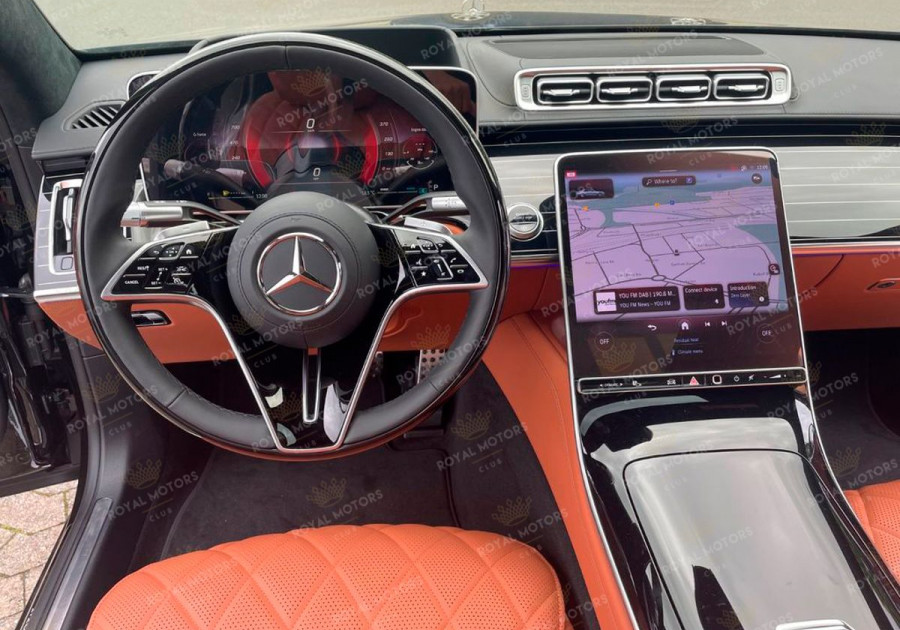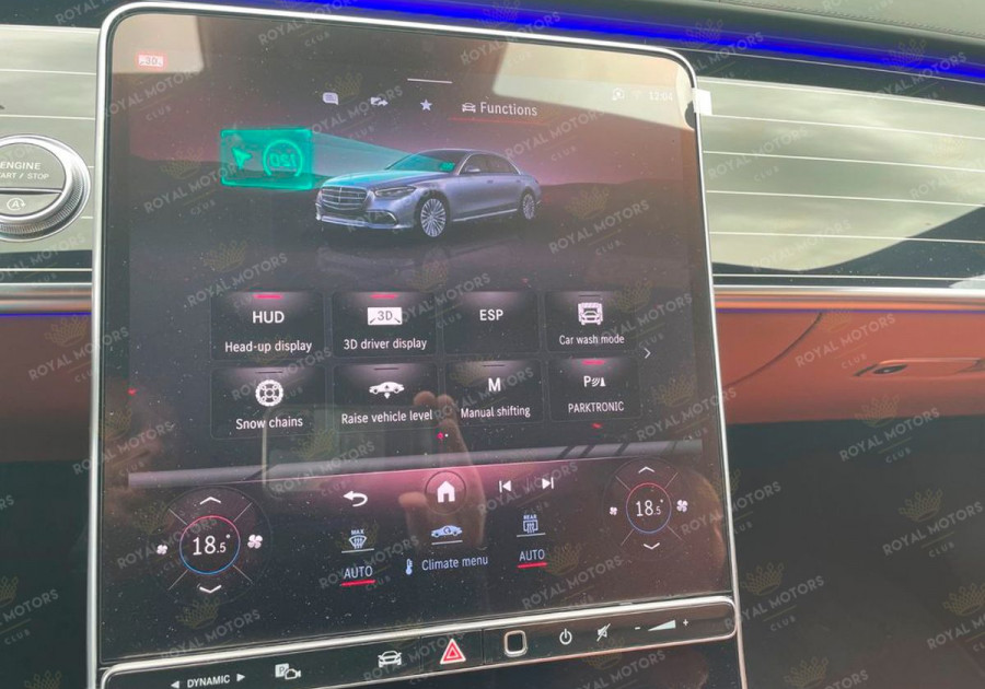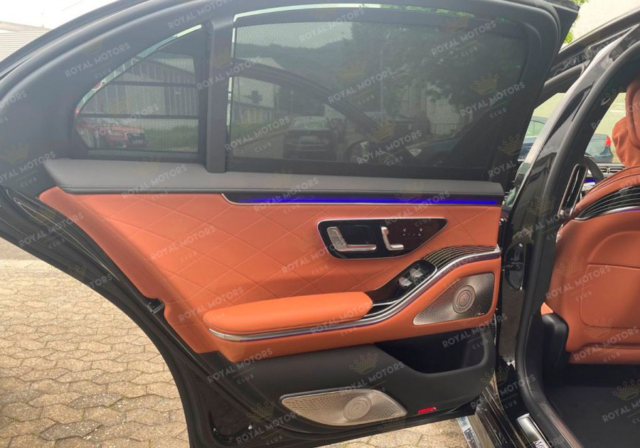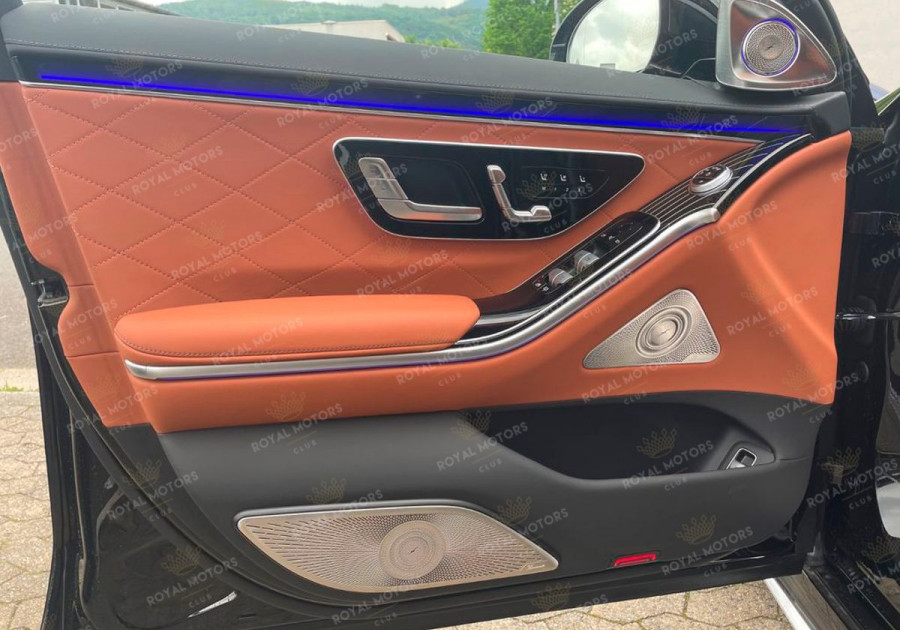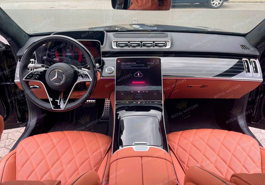 Комплектация оснащена AMG-пакетом, пневматической подвеской, камерами с обзором 360, мониторами в спинках передних сидений, активным круиз-контролем, проекцией, вентиляцией/массажем всех сидений, солнцезащитными шторками и премиальной аудиосистемой Burmester