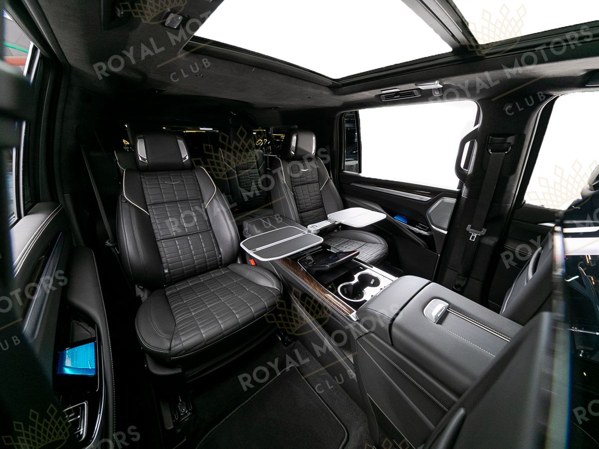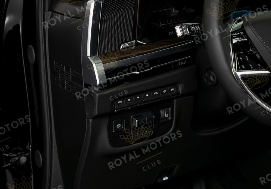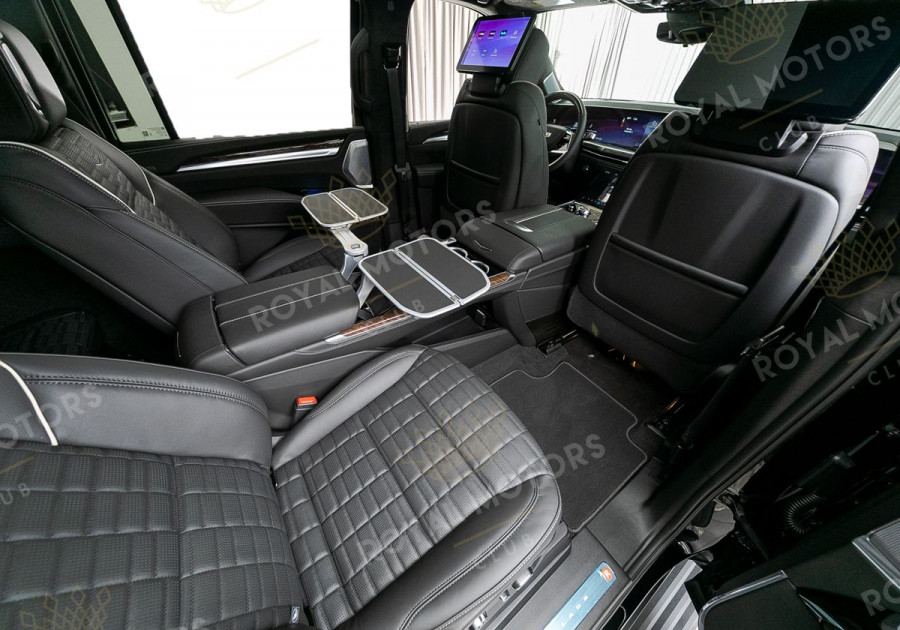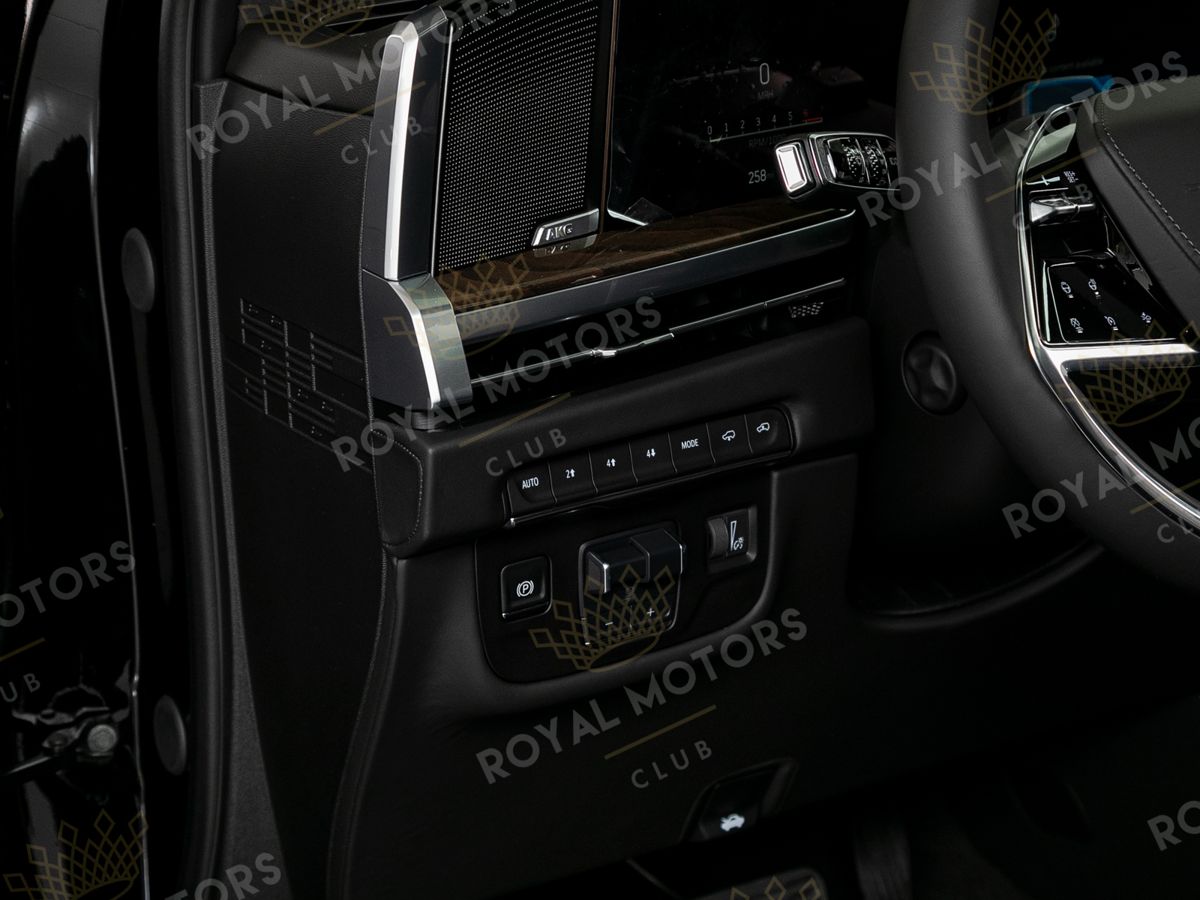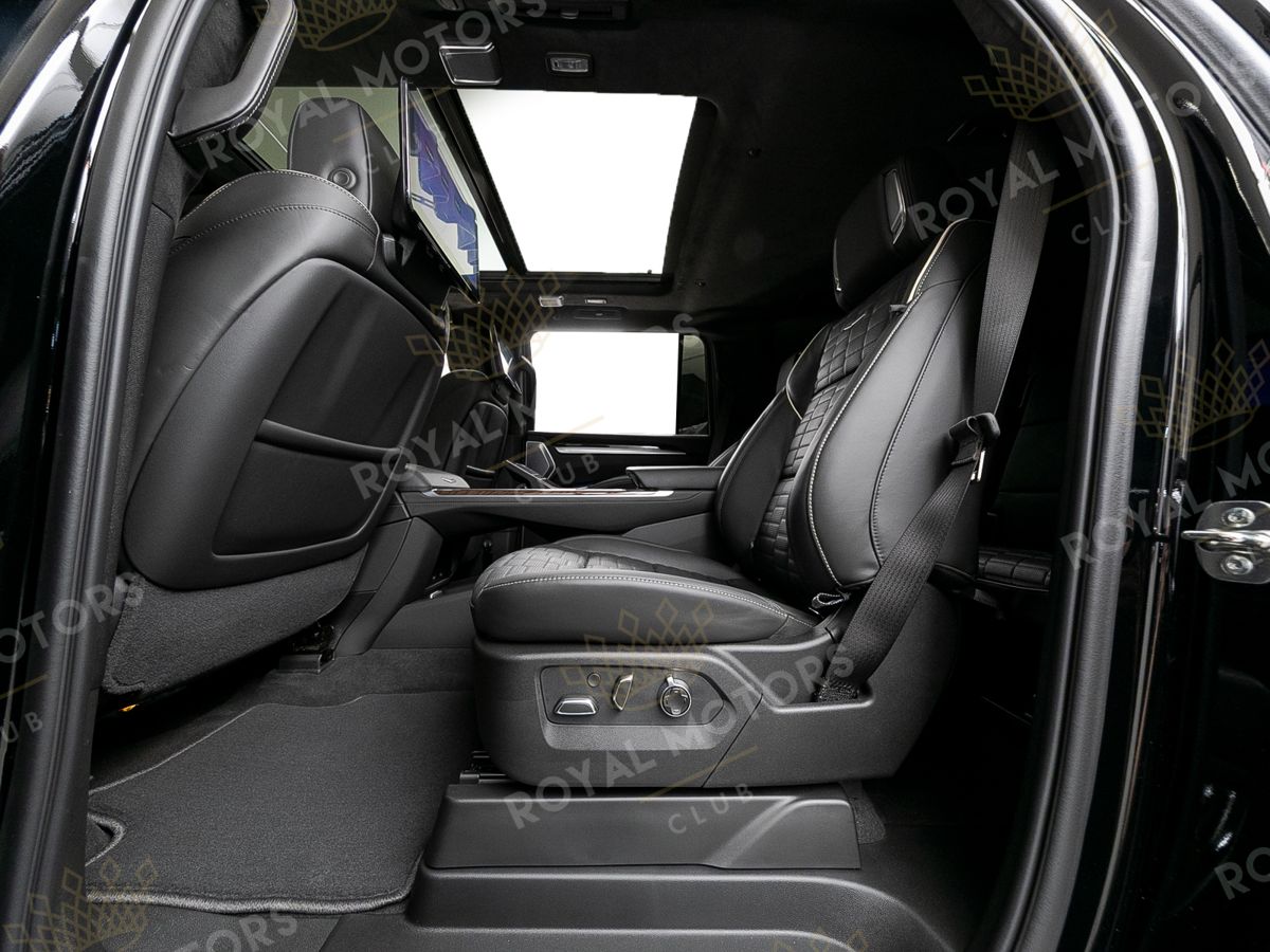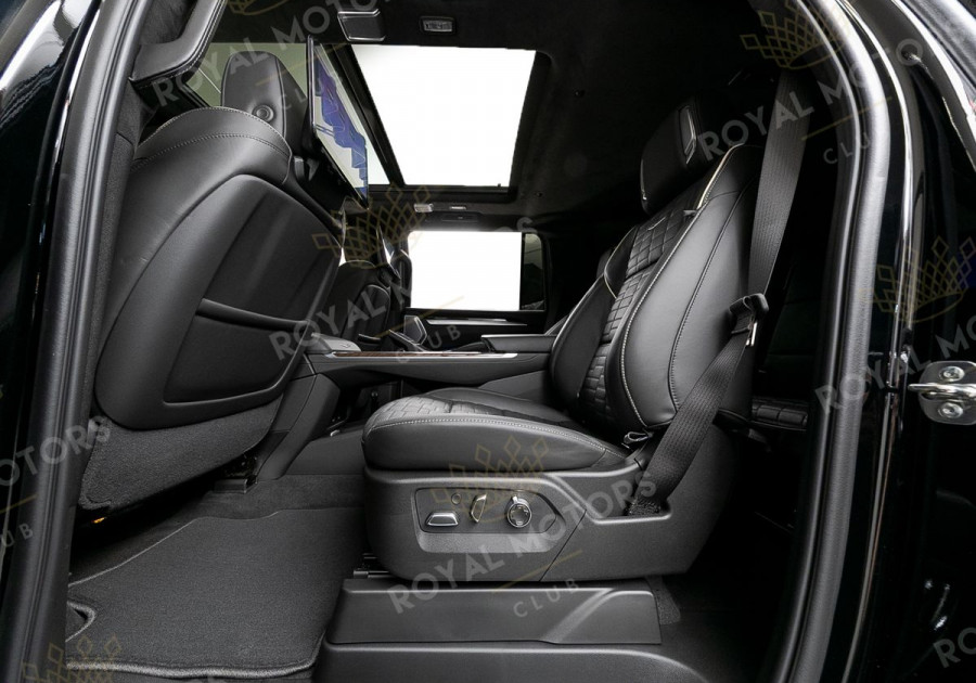 Комплектация оснащена массажем/вентиляцией сидений, мониторами в спинках передних сидений, выдвижными порогами с эл. приводом, пневматической подвеской, системой Super Cruise, камерами с обзором 360, панорамой, системой ночного видения и максимальной аудиосистемой AKG