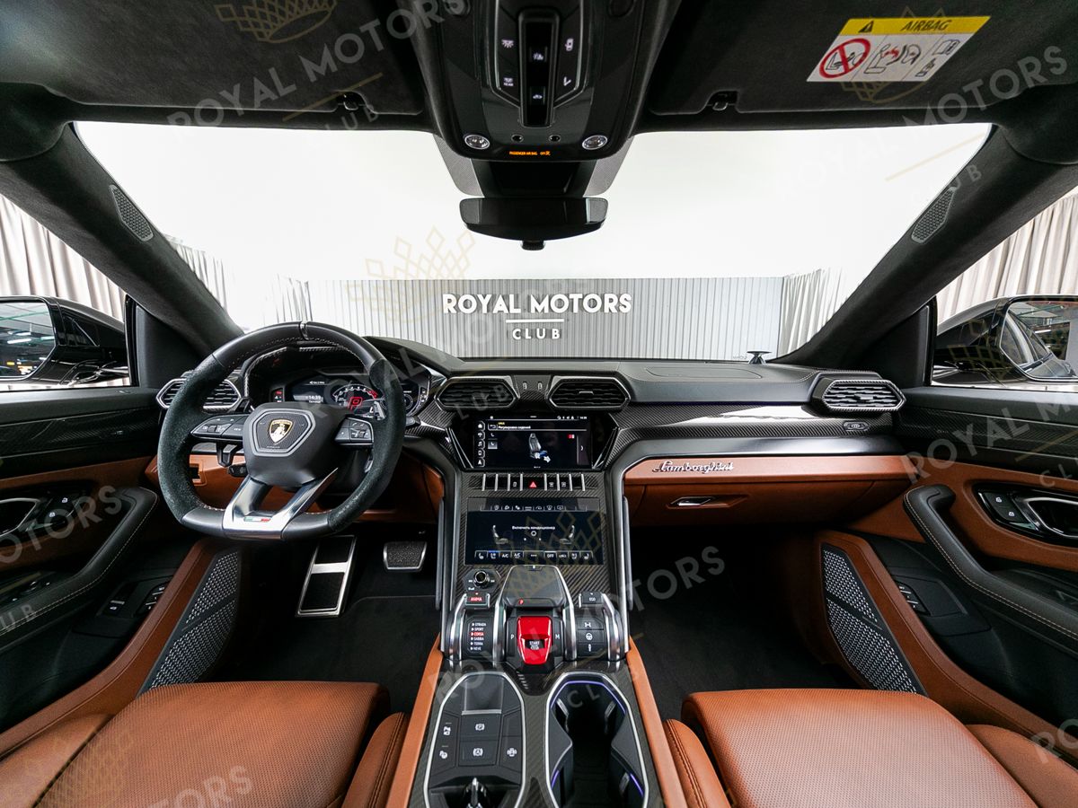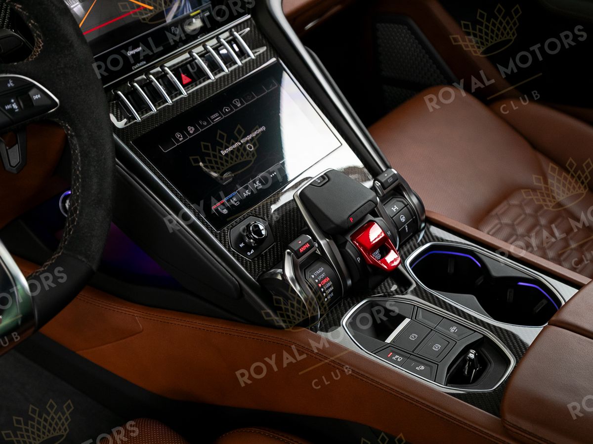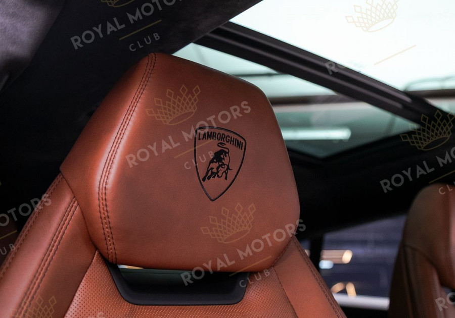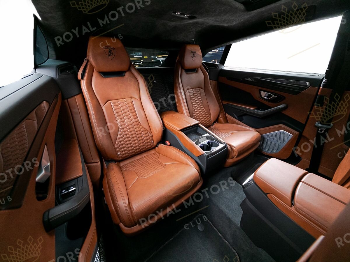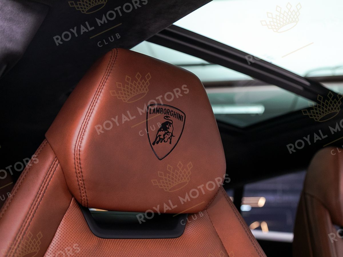 Интерьер декорирован элементами из темного анодированного алюминия на передней панели и дверях, а также деталями из углеволокна в матовом исполнении. Цветовые акценты кузова перекликаются с элементами салона суперкроссовера: яркие контрастные оттенки кожаной отделки центрального тоннеля, боковой поддержки подушек сидений, прострочки в виде традиционного шестиугольного орнамента Q-Citura и вышитого на подголовниках логотипа Lamborghini придают интерьеру еще больше выразительности.