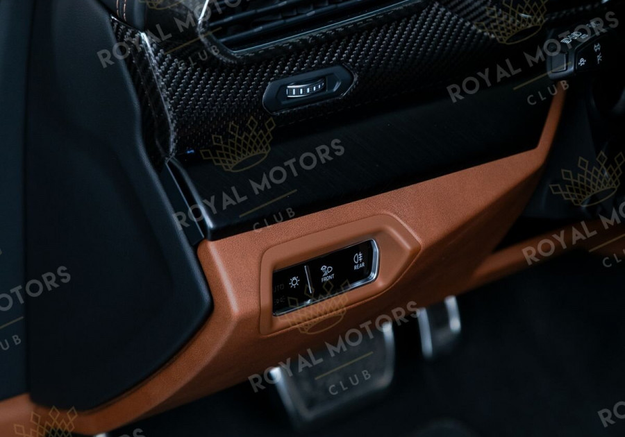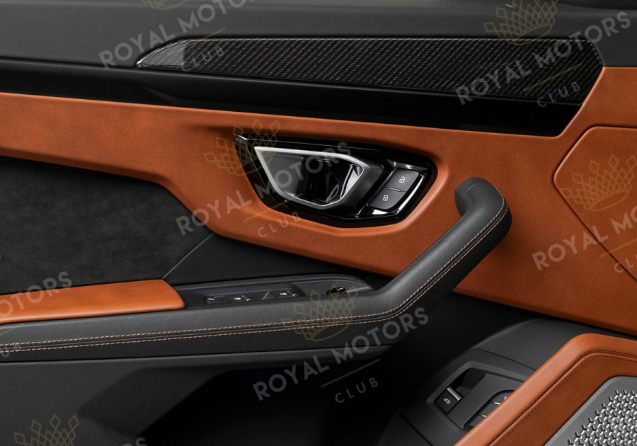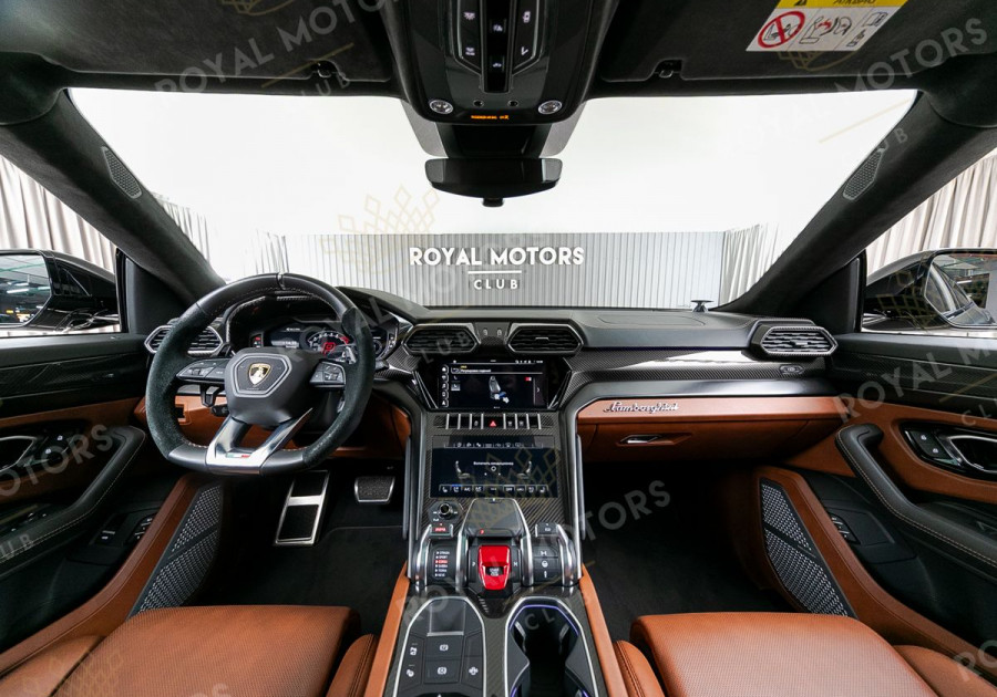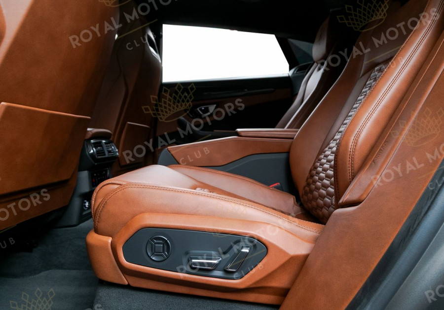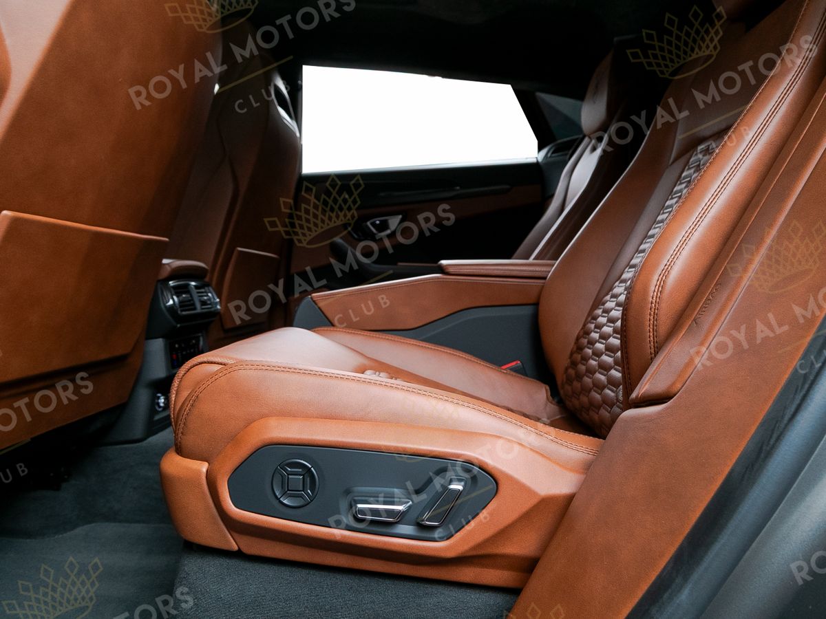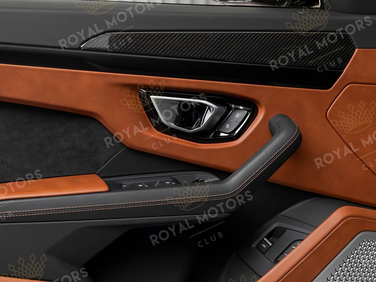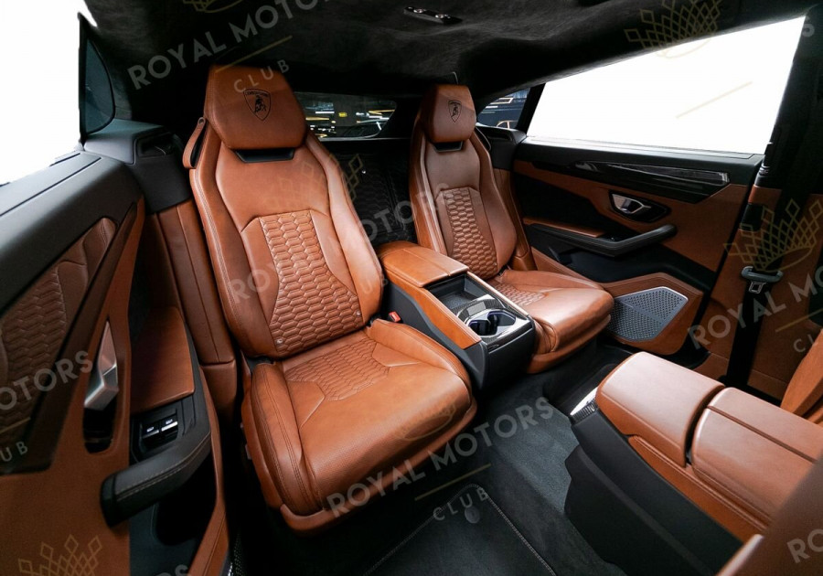Интерьер декорирован элементами из темного анодированного алюминия на передней панели и дверях, а также деталями из углеволокна в матовом исполнении. Цветовые акценты кузова перекликаются с элементами салона суперкроссовера: яркие контрастные оттенки кожаной отделки центрального тоннеля, боковой поддержки подушек сидений, прострочки в виде традиционного шестиугольного орнамента Q-Citura и вышитого на подголовниках логотипа Lamborghini придают интерьеру еще больше выразительности.
