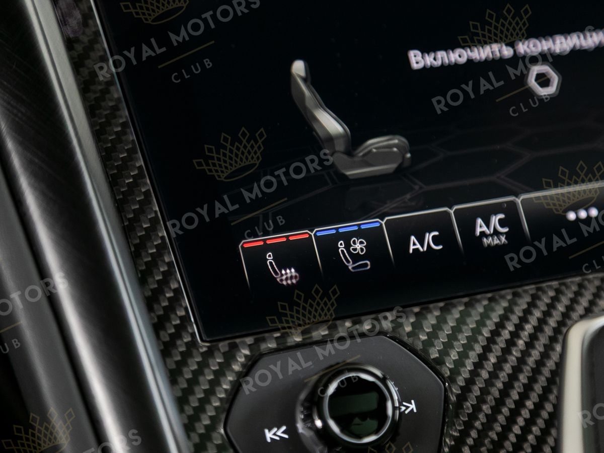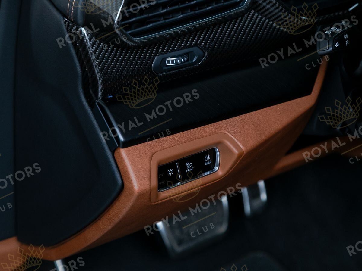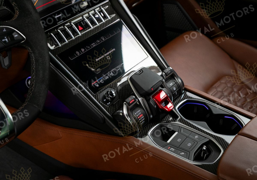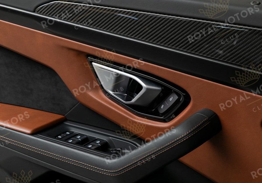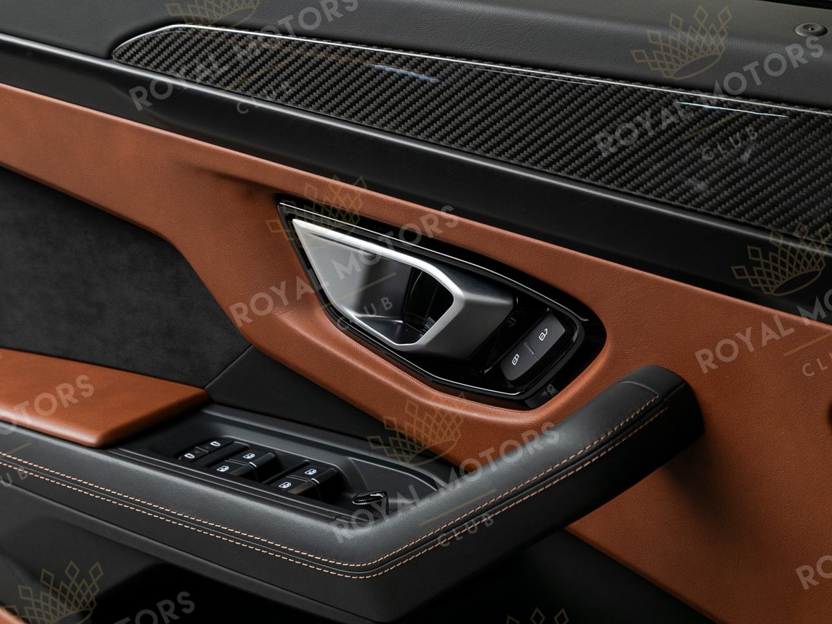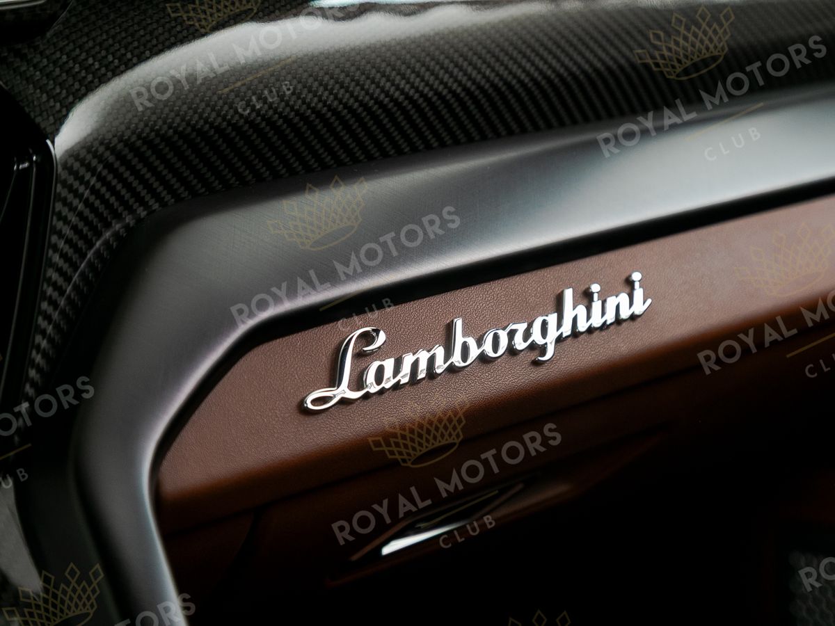Интерьер декорирован элементами из темного анодированного алюминия на передней панели и дверях, а также деталями из углеволокна в матовом исполнении. Цветовые акценты кузова перекликаются с элементами салона суперкроссовера: яркие контрастные оттенки кожаной отделки центрального тоннеля, боковой поддержки подушек сидений, прострочки в виде традиционного шестиугольного орнамента Q-Citura и вышитого на подголовниках логотипа Lamborghini придают интерьеру еще больше выразительности.