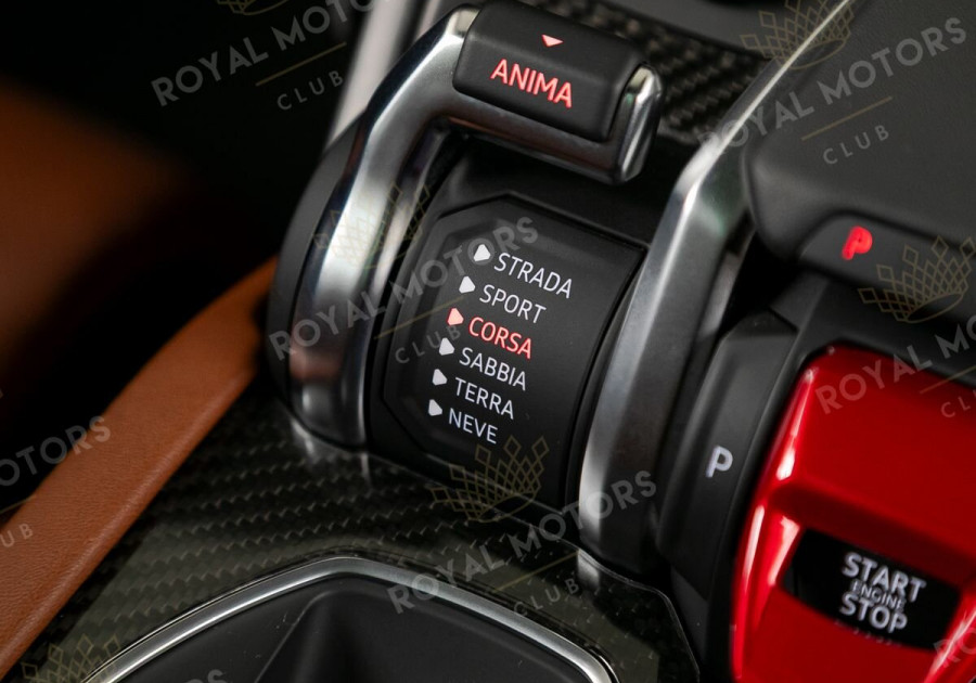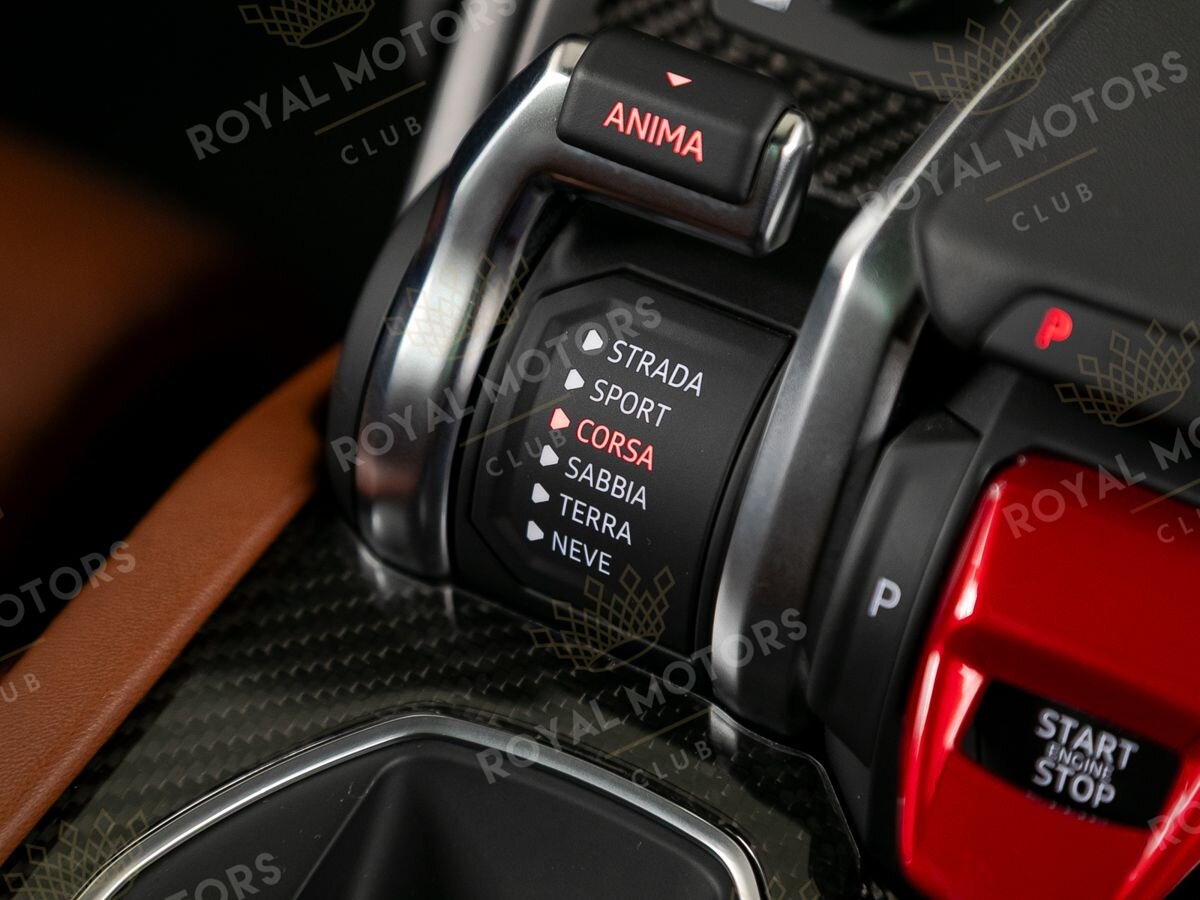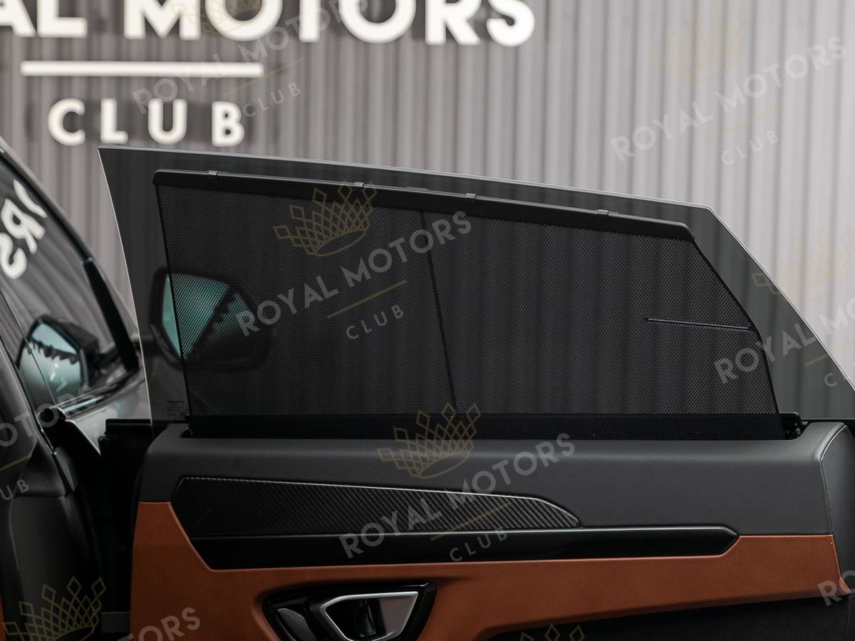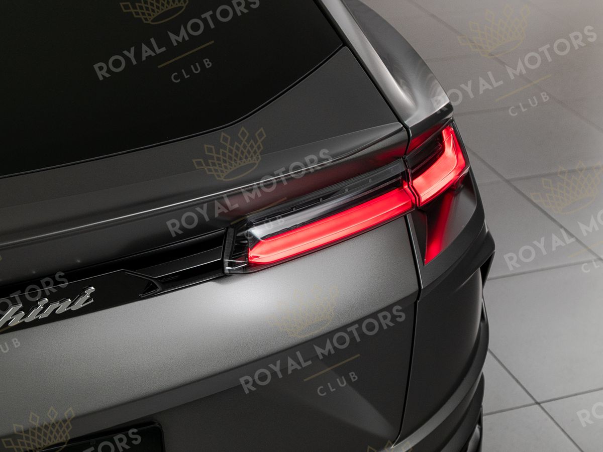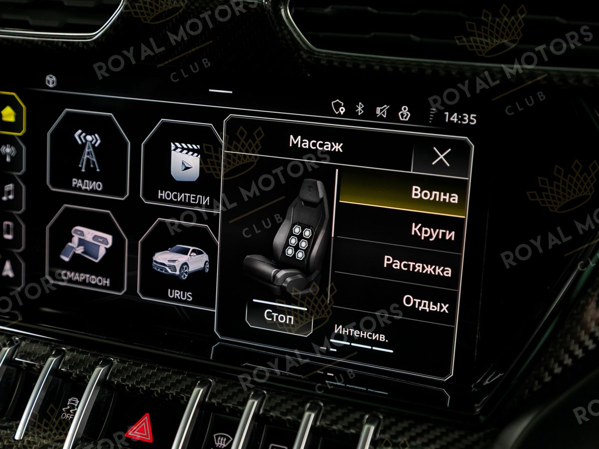Интерьер декорирован элементами из темного анодированного алюминия на передней панели и дверях, а также деталями из углеволокна в матовом исполнении. Цветовые акценты кузова перекликаются с элементами салона суперкроссовера: яркие контрастные оттенки кожаной отделки центрального тоннеля, боковой поддержки подушек сидений, прострочки в виде традиционного шестиугольного орнамента Q-Citura и вышитого на подголовниках логотипа Lamborghini придают интерьеру еще больше выразительности.