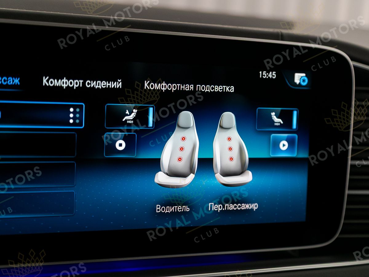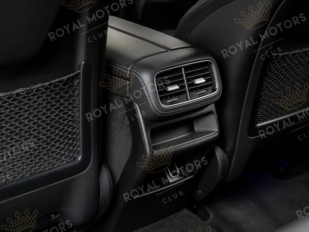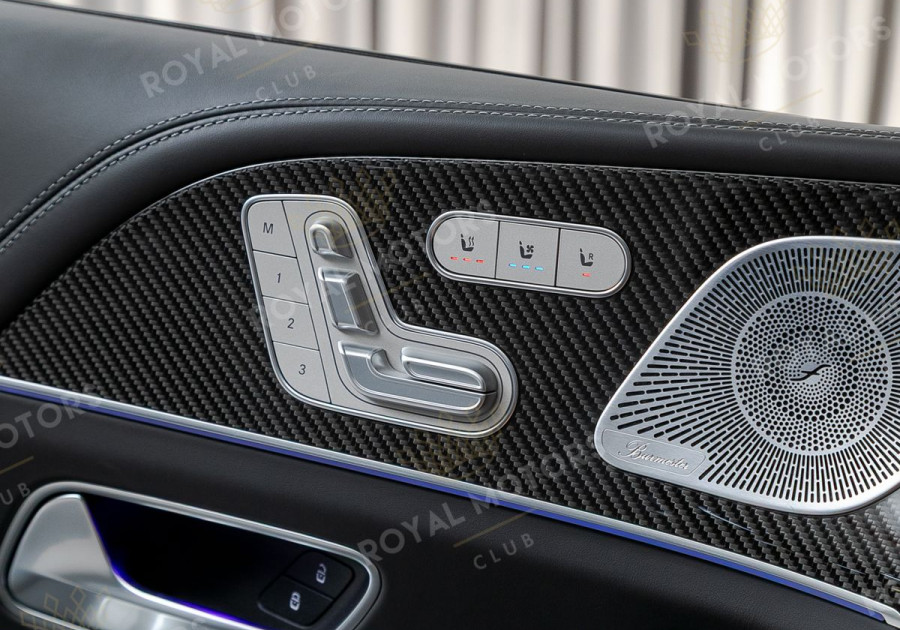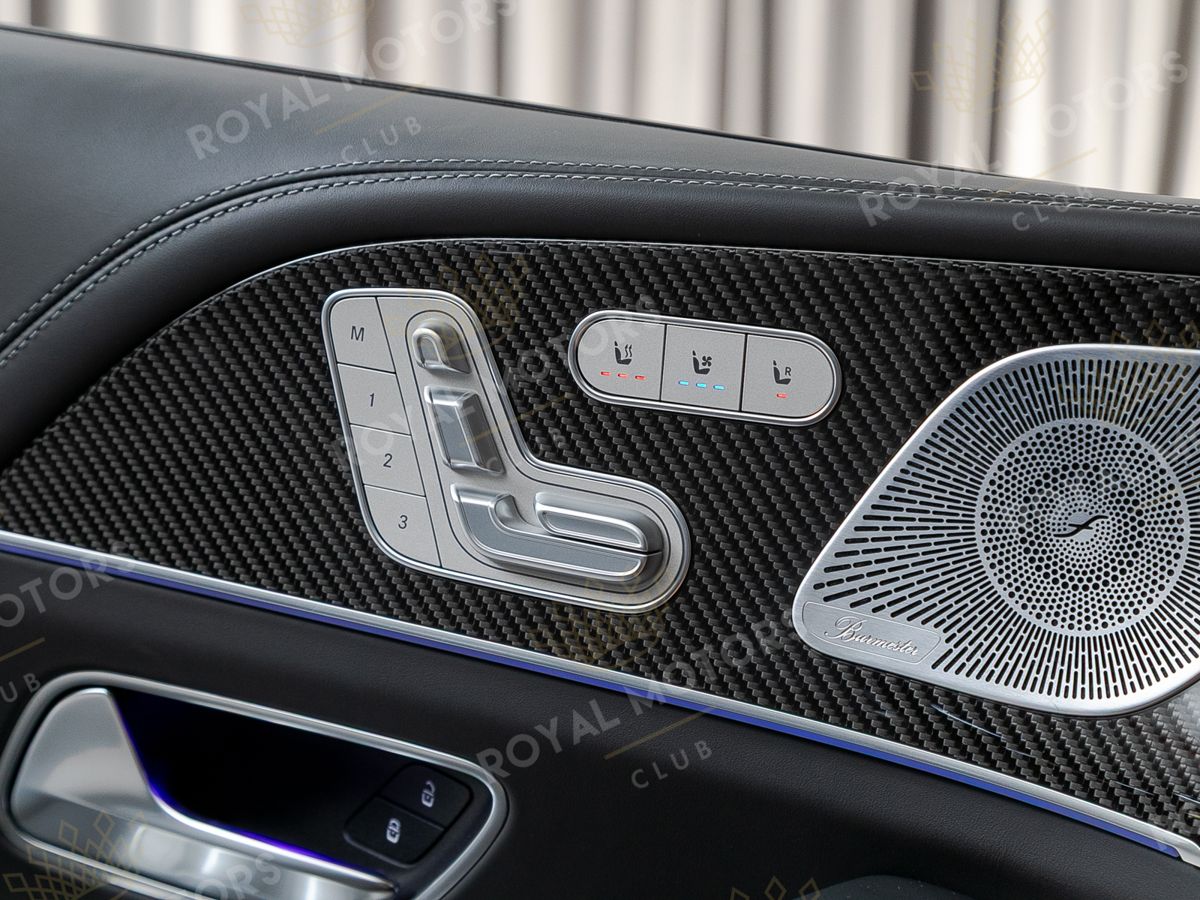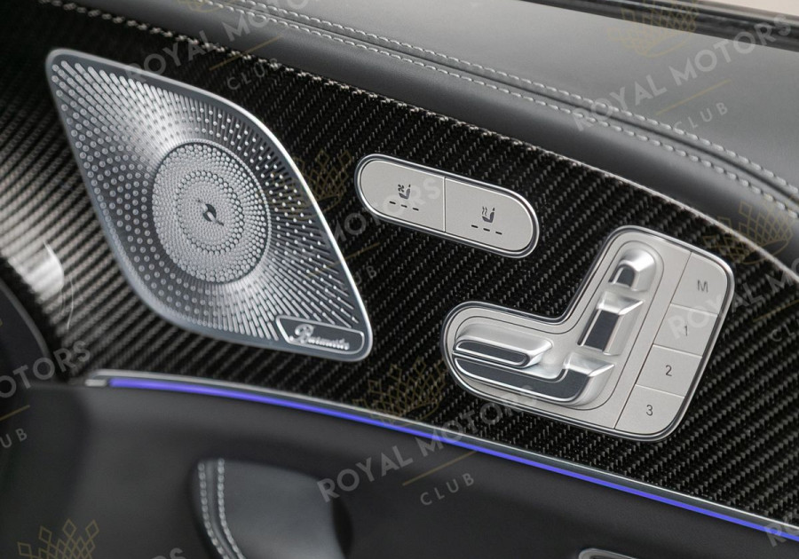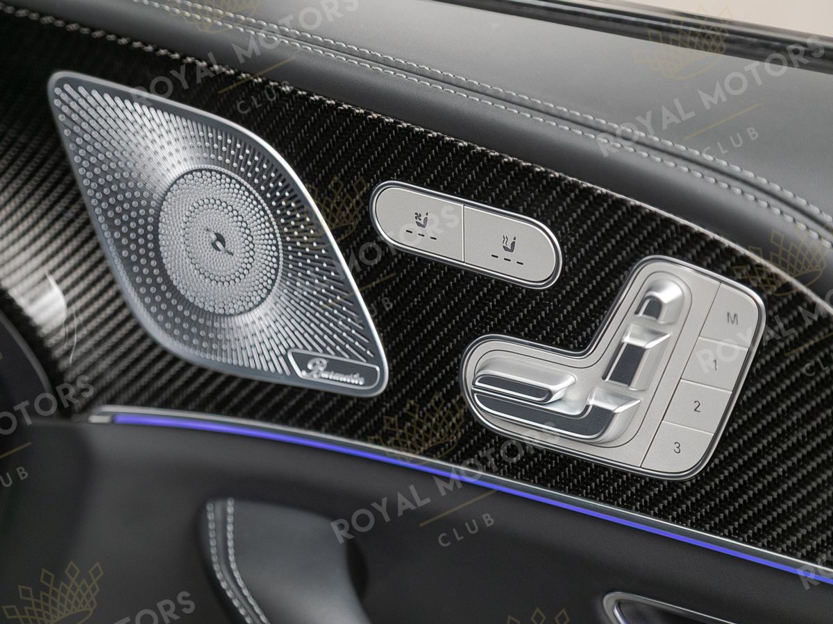 Комплектация оснащена карбон-пакетом интерьера, Night-пакетом, пневматической подвеской, массажем/вентиляцией сидений, камерами с обзором 360, активным круиз-контролем, Intelligent Light System, проекцией и премиальной аудиосистемой Burmester.