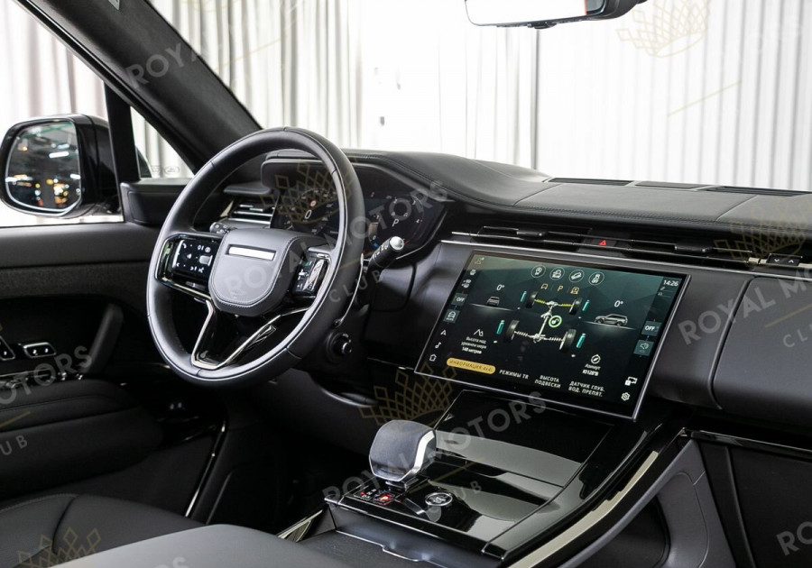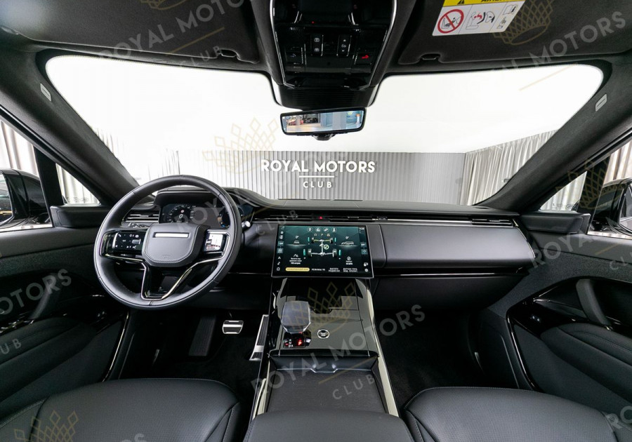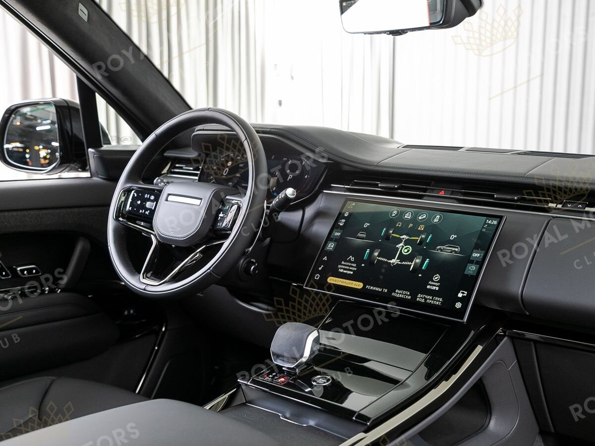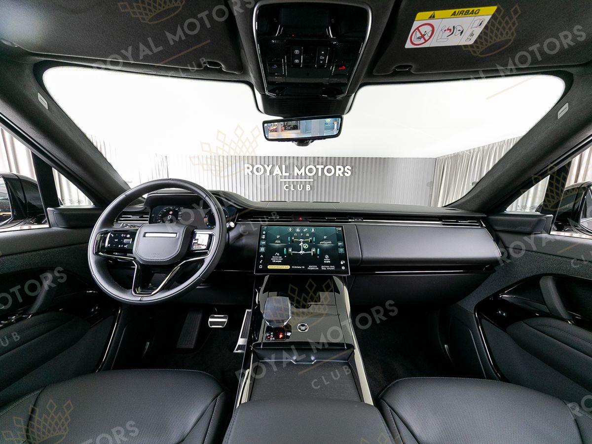 В салоне передняя панель по стандарту Range Rover Sport наиболее близка к спортивному стилю. Функционал кроссовера настраивается изогнутым сенсорным дисплеем головного устройства диагональю 13,1. Присутствует управление голосом, за что отвечает виртуальный ассистент Amazon Alexa.