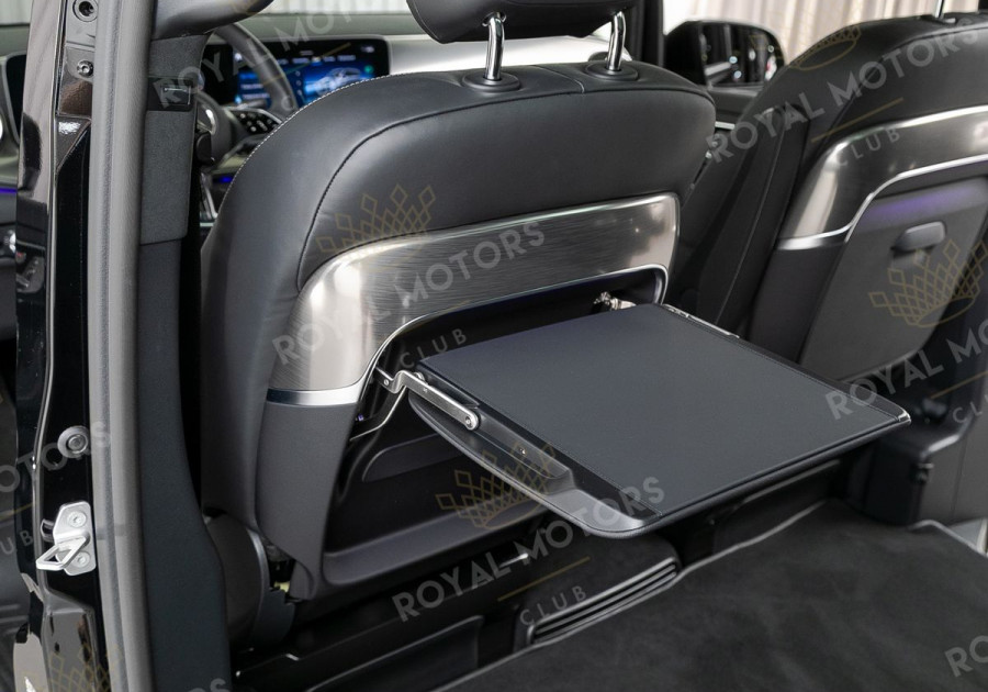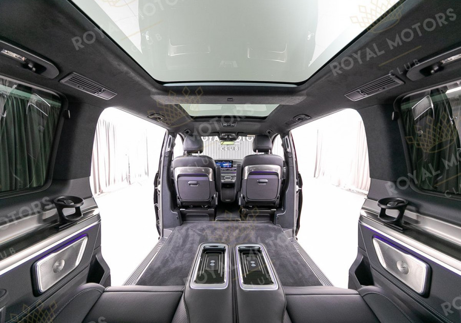 Комплектация оснащена пультом Webasto, панорамой, пневматической подвеской, камерами с обзором 360, массажем/вентиляцией сидений, капитанскими сиденьями с системой оттоман, складными столами, эл приводом передних сидений и премиальной аудиосистемой Burmester.